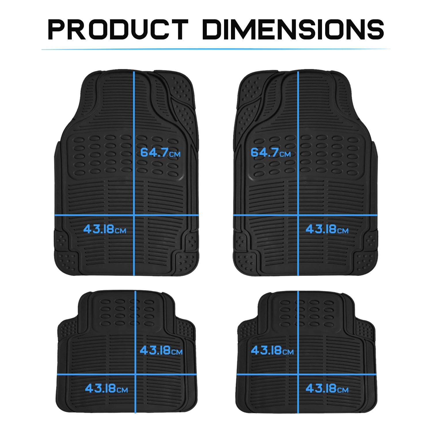 - ALL-WEATHER DEFENSE: This four-piece set of premium rubber floor mats offers robust protection for your car's interior against dirt, mud, snow, and debris. Built to withstand extreme temperatures, they remain flexible and durable without warping.