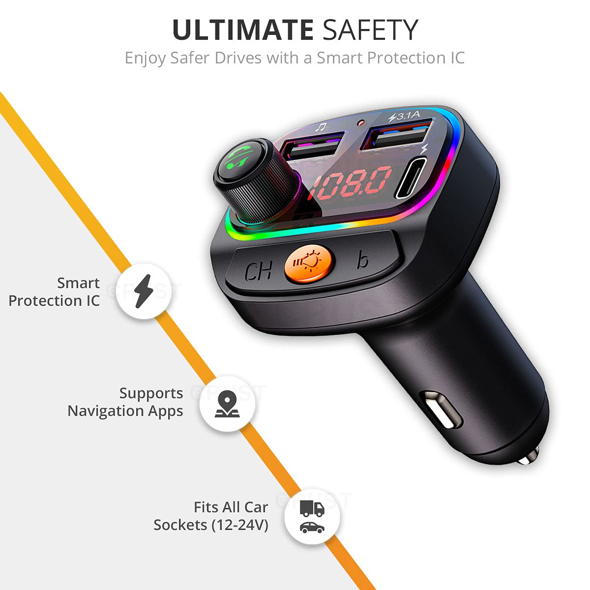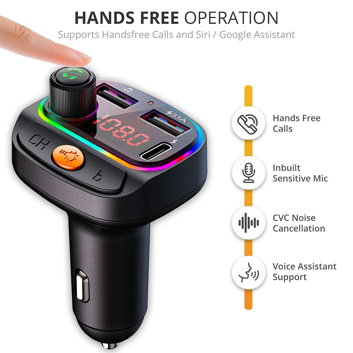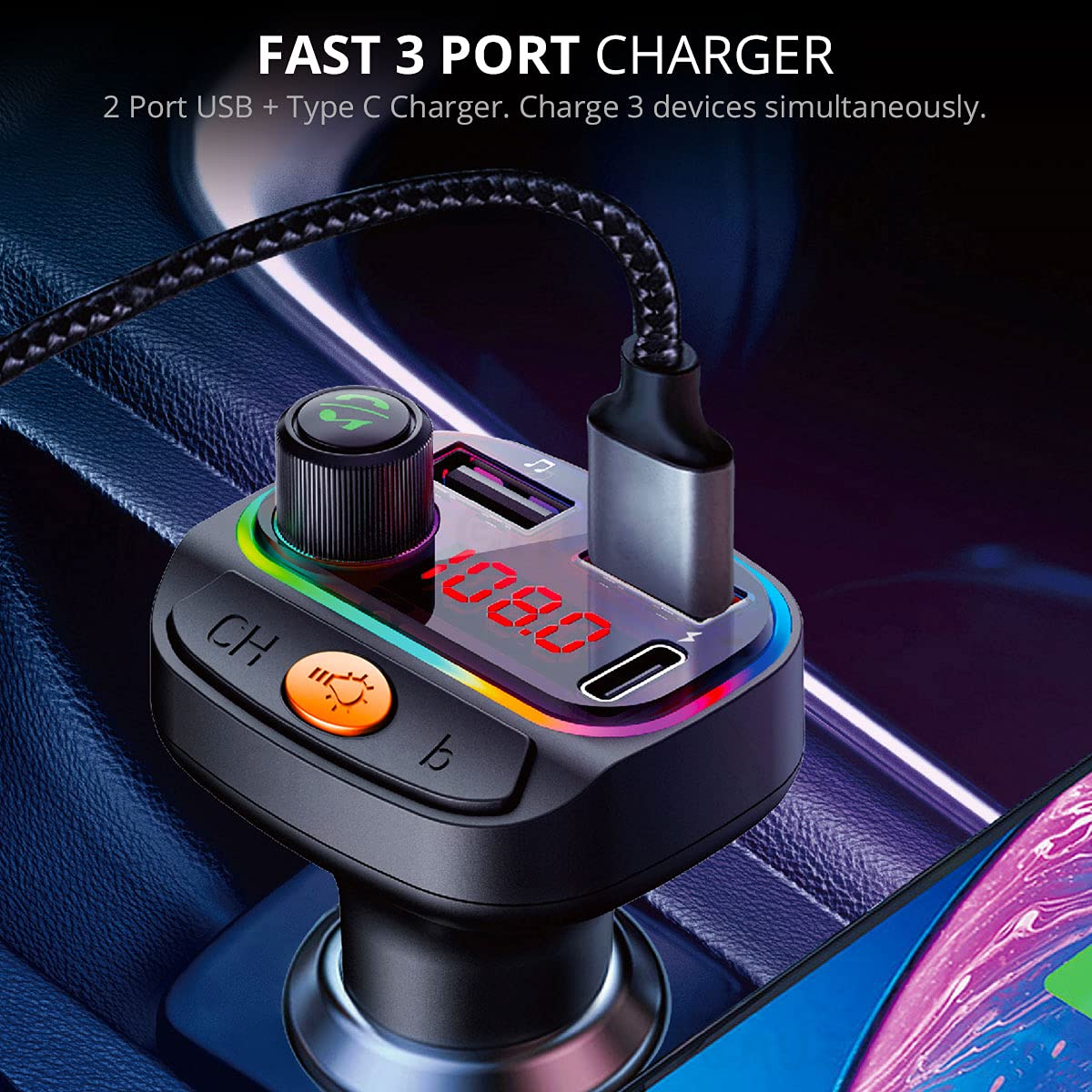 Car Bluetooth Device with Call Receiver, FM Transmitter for Music System & Dual USB + Type C Charger; 7 Color LED Lights; USB MP3 Support; Voice Assistant