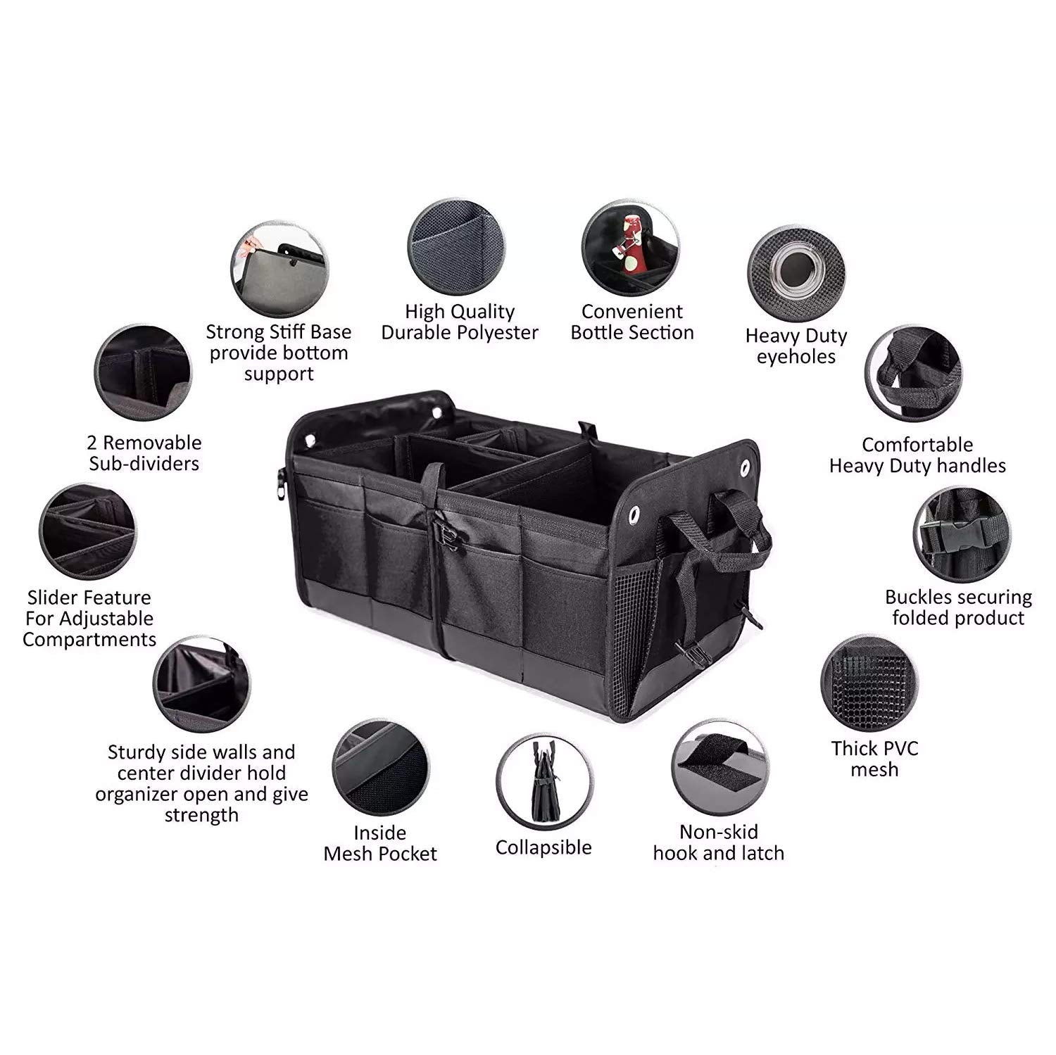 - INNOVATIVE DESIGN AND MULTI-FACETED DESIGN - The cargo storage container was designed and invented after months of testing and sampling with the best factories. It combines all the strengths and addresses the shortcomings of existing trunk organizers. It has the most pockets, 3 compartments, removable sub-dividers, can be folded half-length as a seat organizer, light weight yet unbreakable. It is fully-collapsible for easy storage, and is designed to prevent your cargo from .